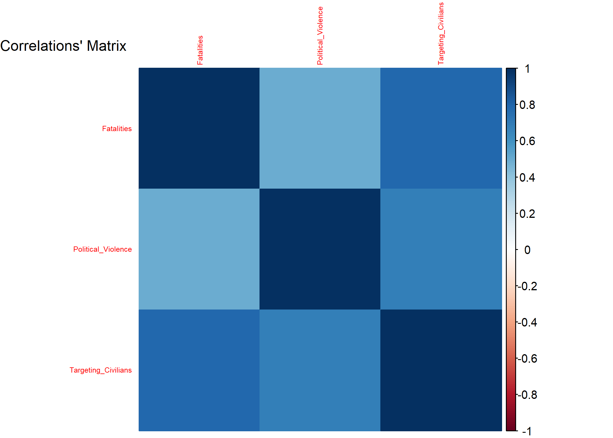 We observe that all correlations are significant at 0.01 p-value and they are positive, as expected. We see that Number of Fatalities and Number of Events Targeting Civilians show the highest correlation with each other.
